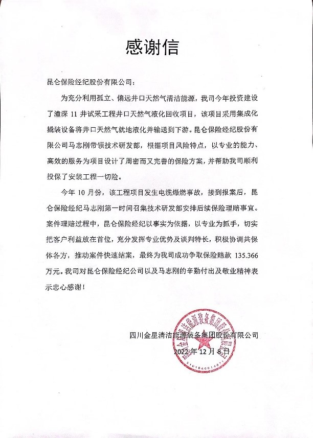 近日,公司收到四川金星清洁能源装备集团股份有限公司(以下简称“金星集团”)发来的感谢信。信中,金星集团感谢昆仑保险经纪成功为潼深11井天然气液化回收工程项目争取保险赔款135.37万元,并对公司在整个保险安排过程中展现出的专业优势和敬业精神表示高度赞赏。