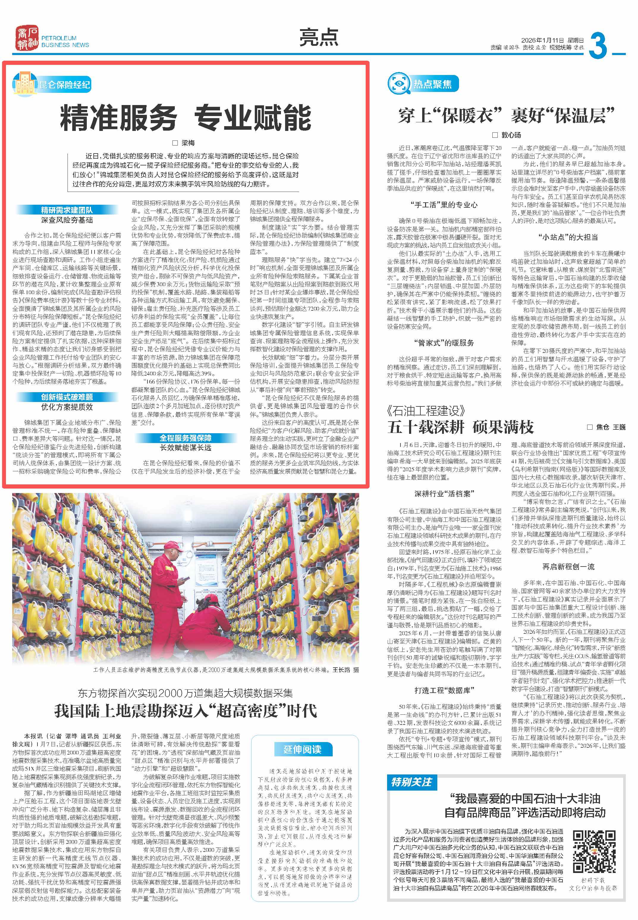 1月11日,昆仑保险经纪服务实体经济典型案例《精准服务 专业赋能》在集团公司核心媒体平台《石油商报》刊发。该案例以公司服务东北地区规模最大的大型国有石化炼化企业——锦城集团的具体实践为核心,系统呈现了公司为企业量身定制风险保障方案、提供全流程服务的扎实成果,生动诠释了昆仑保险经纪深耕石油石化风险领域,以精准服务对接企业需求痛点、助力企业降本增效、高质量发展的专业能力与价值贡献。