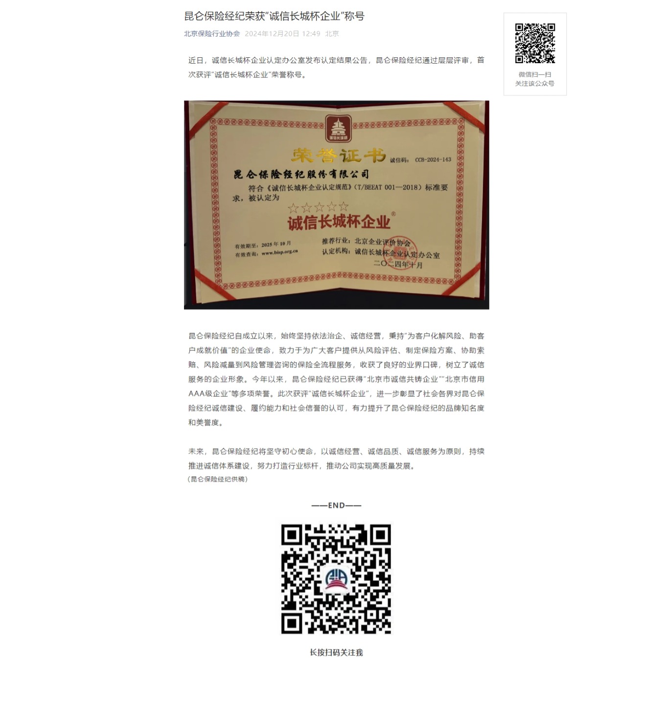 北京保险学会微信公众号:昆仑保险经纪荣获“诚信长城杯企业”称号